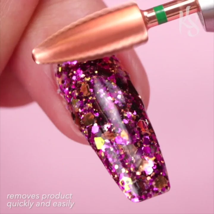 Kiara Sky's Typhoon Coarse Bit is a black coated carbide bit designed to remove product as fast as possible. Using this bit is the fastest and easiest way to remove product, whether you're removing product, reshaping a nail, or removing extra product. Effortlessly remove as much product as possible without burning or cutting your clients!